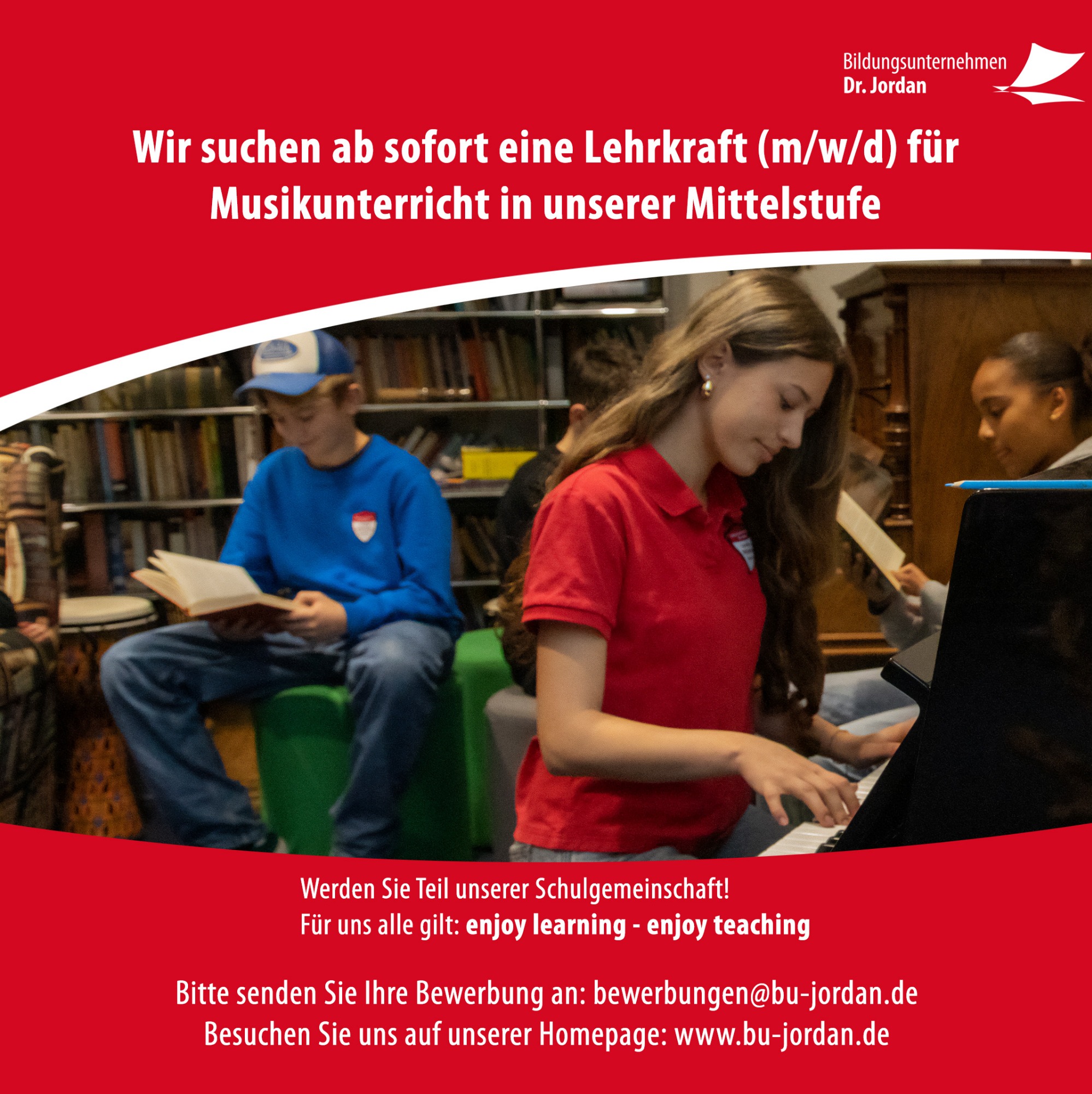 Wir suchen ab sofort eine Lehrkraft für das Fach Musik an unserer Mittelstufe (Teilzeit - 14 Std.).